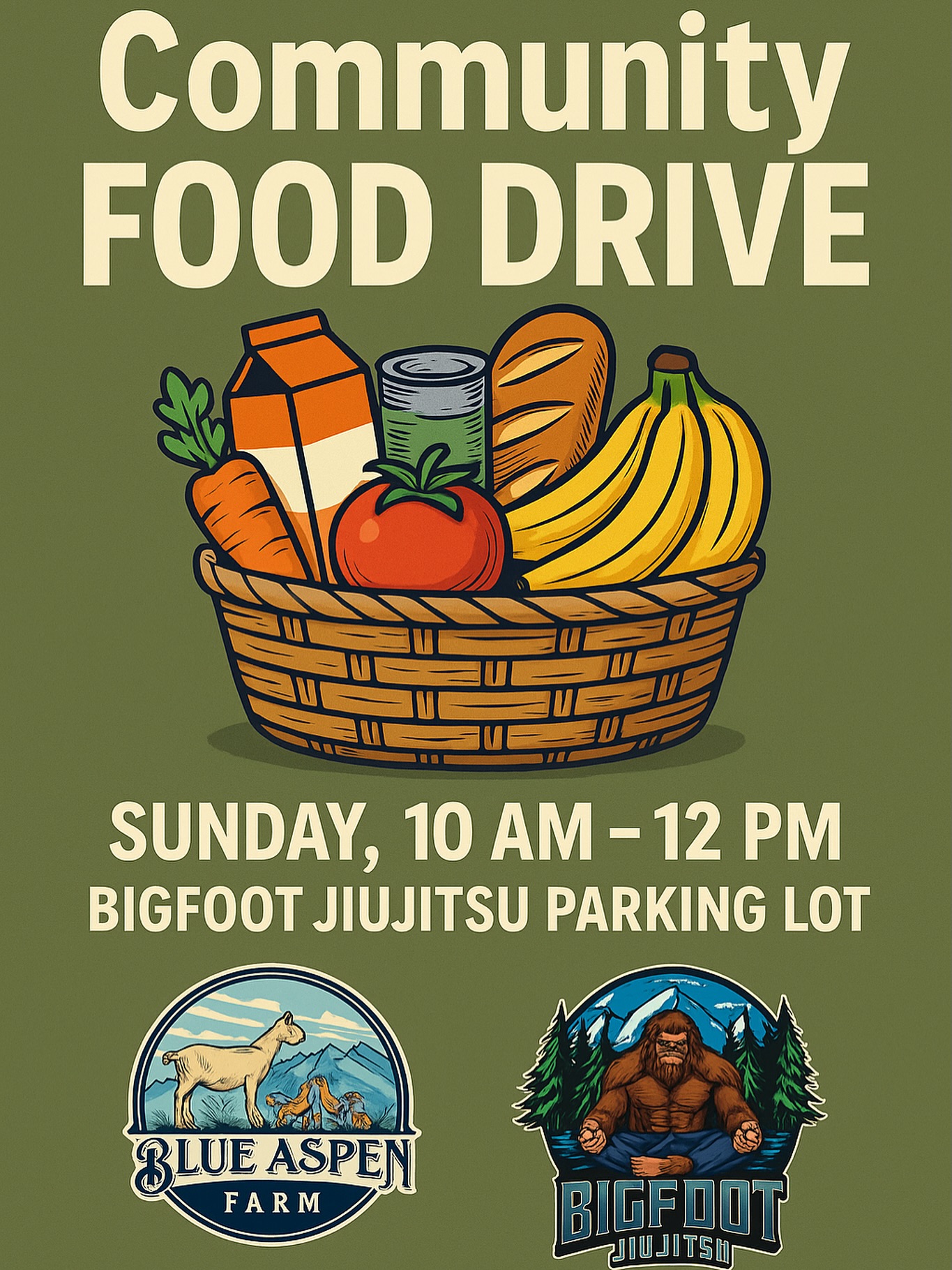 Bigfoot Jiujitsu and Blue Aspen Farm are hosting a Community Food Bank this Sunday to help local families in need. Each bag feeds a family for one week.